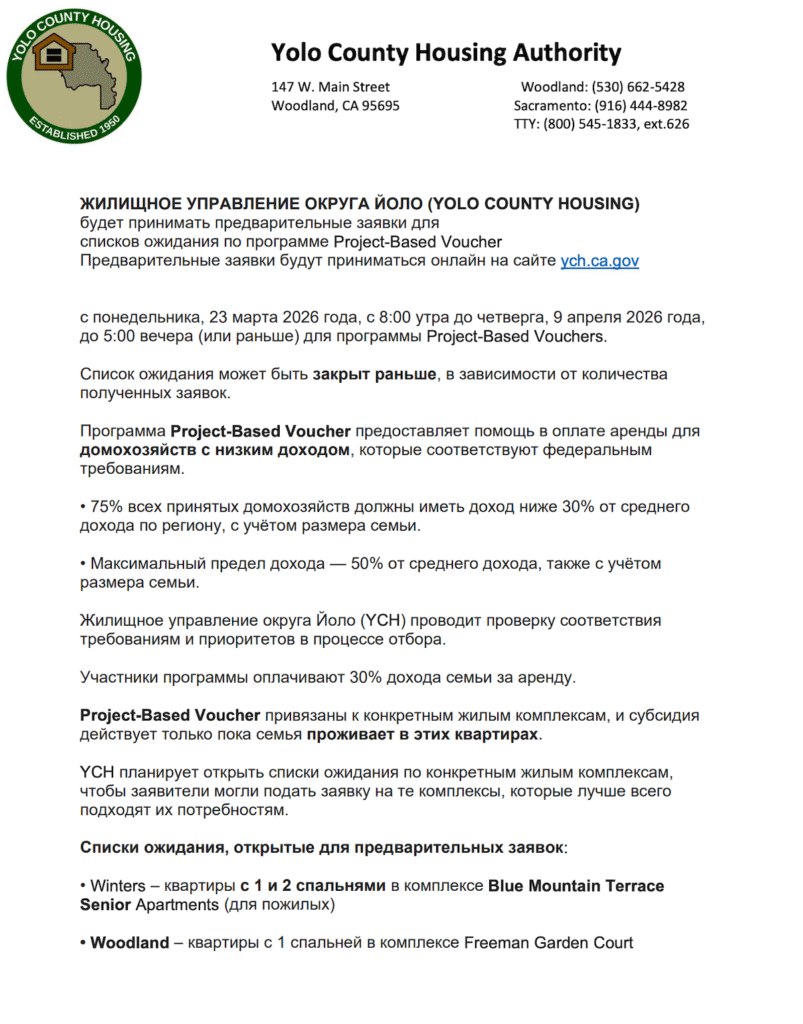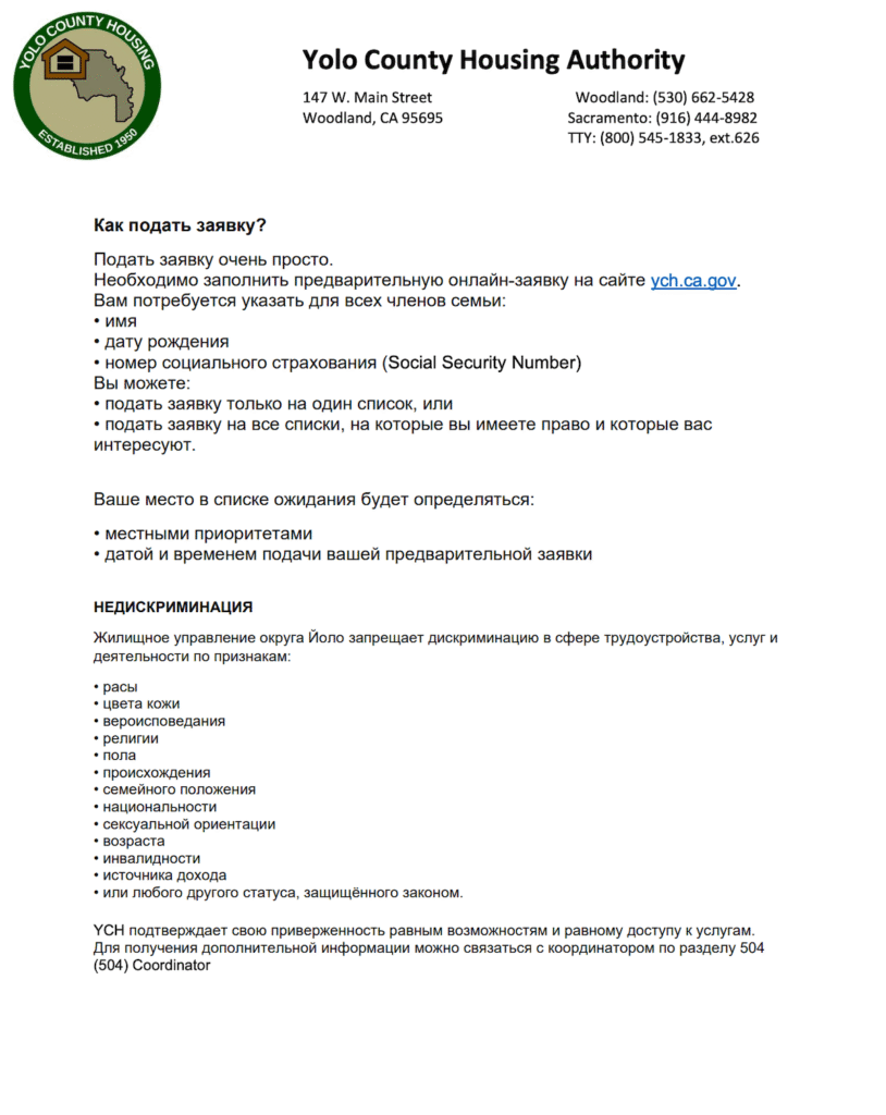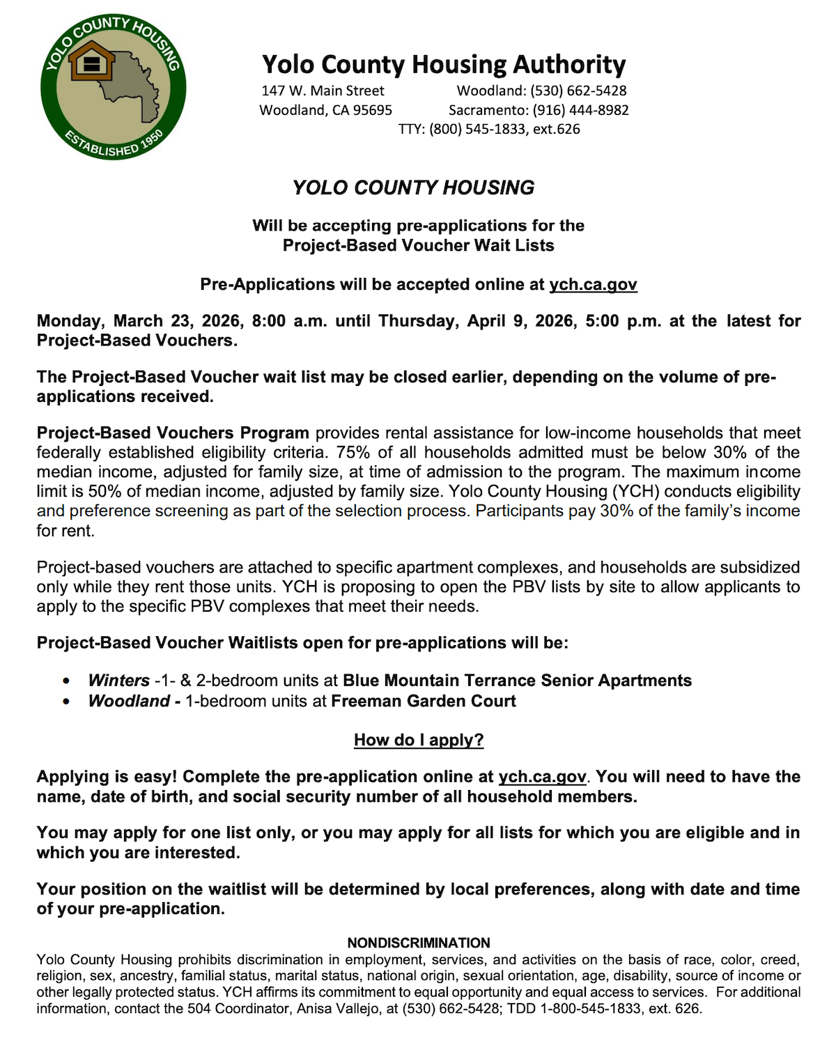 Yolo County Housing Authority, also known as Yolo County Housing or YCH, is dedicated to establishing and maintaining quality, affordable housing, and community development support to everyone within its service area. YCH was first created in 1950. Its primary programs are funded through the Federal US Department of Housing and Urban Development (HUD) and through the State of California Department of Housing and Community Development (HCD) Office of Migrant Services (OMS).